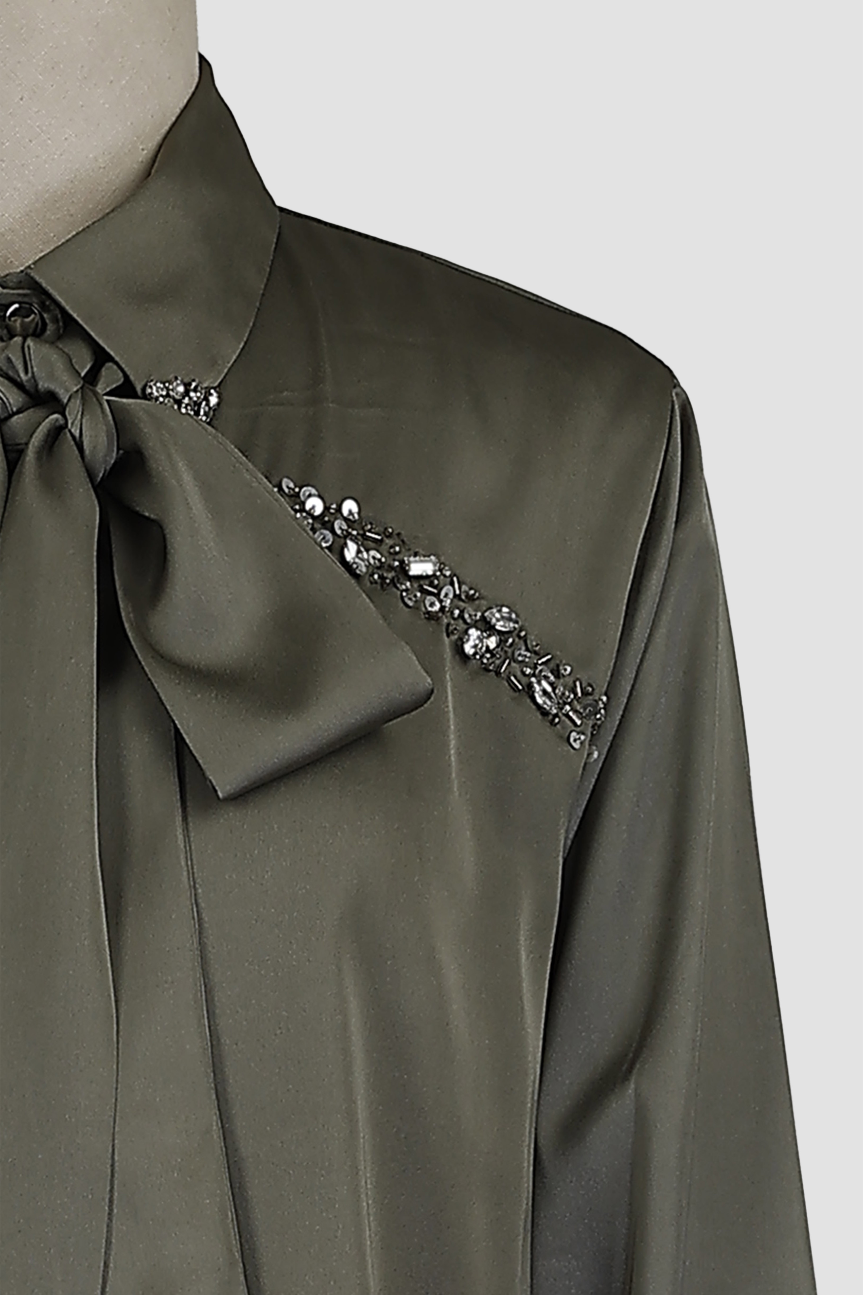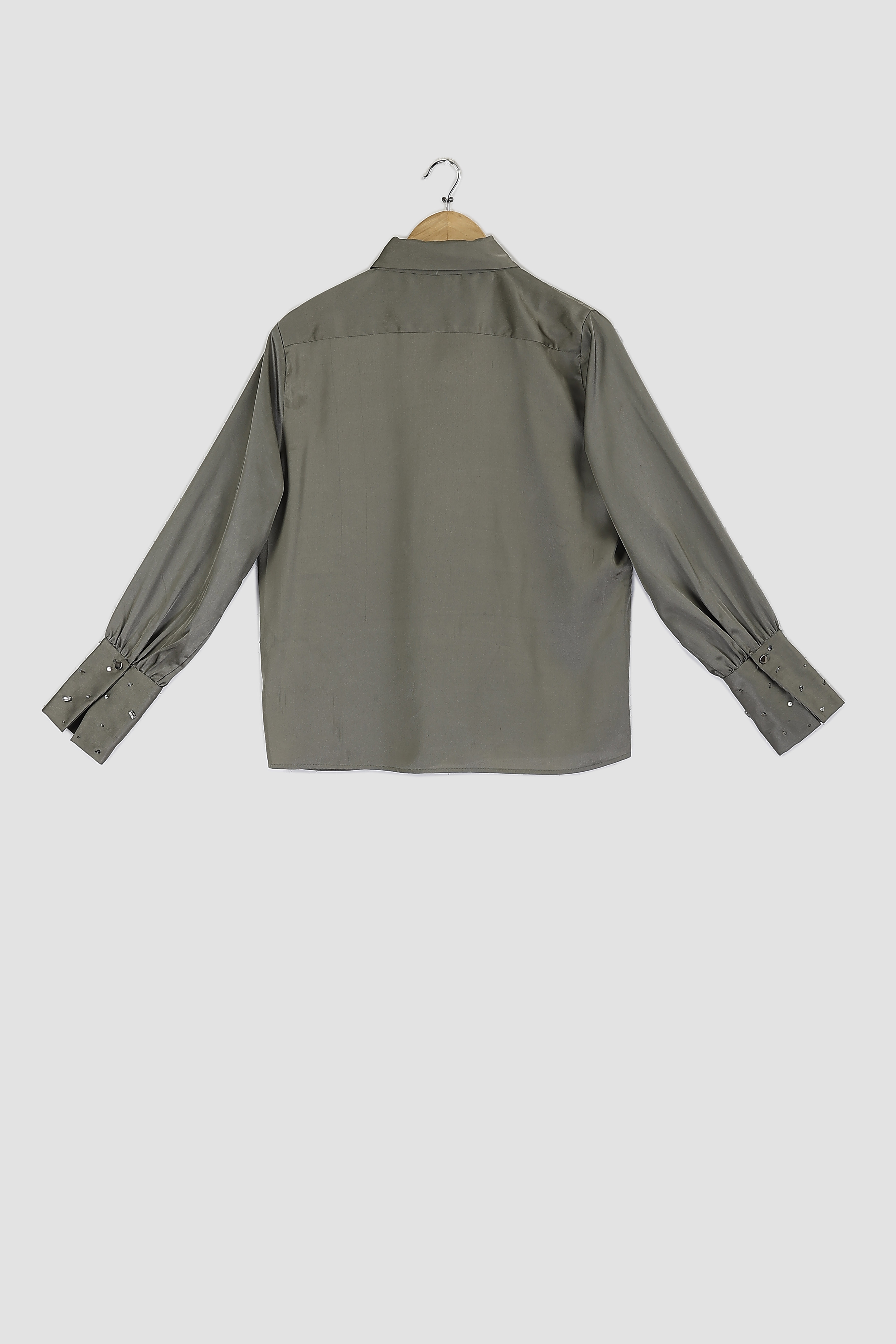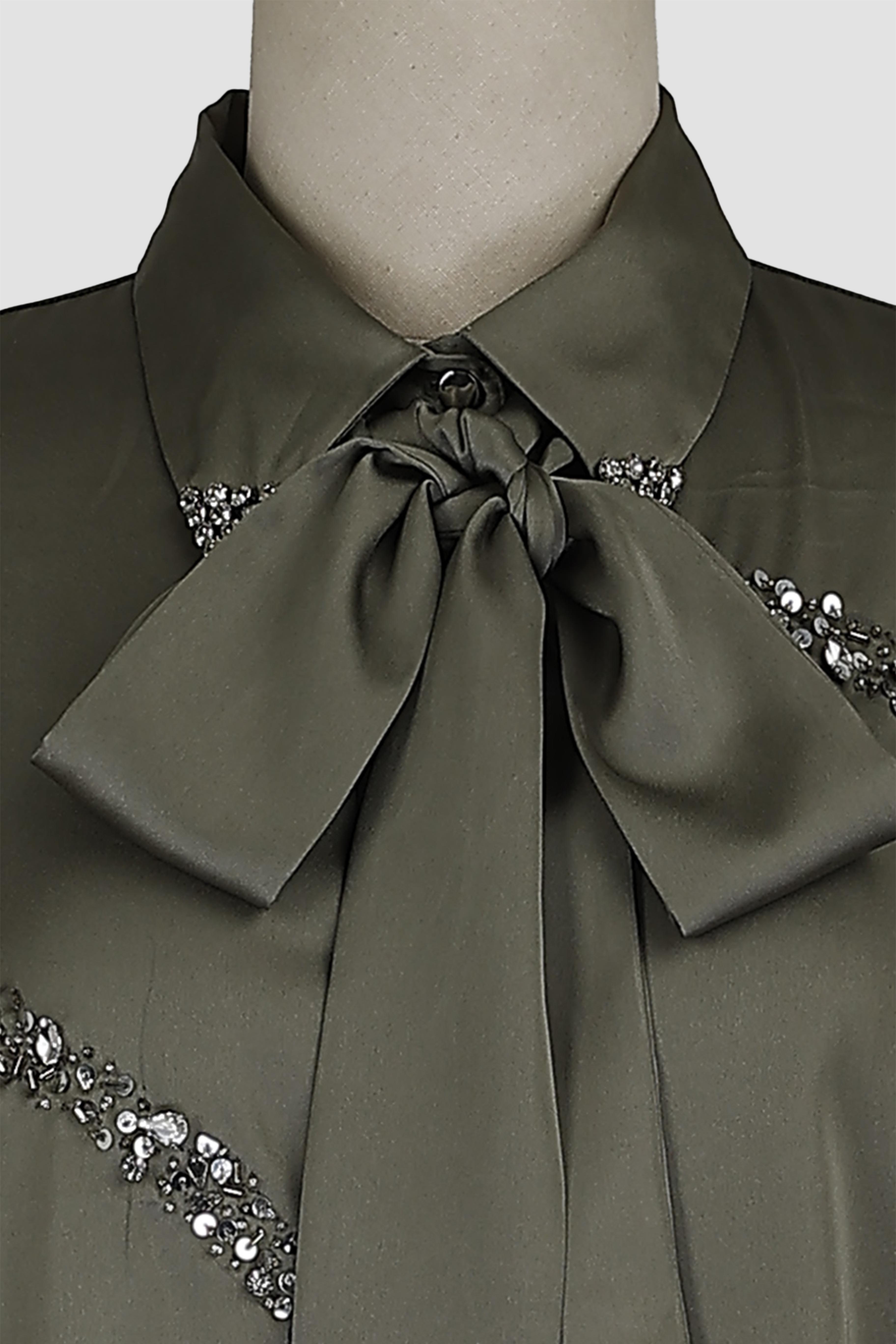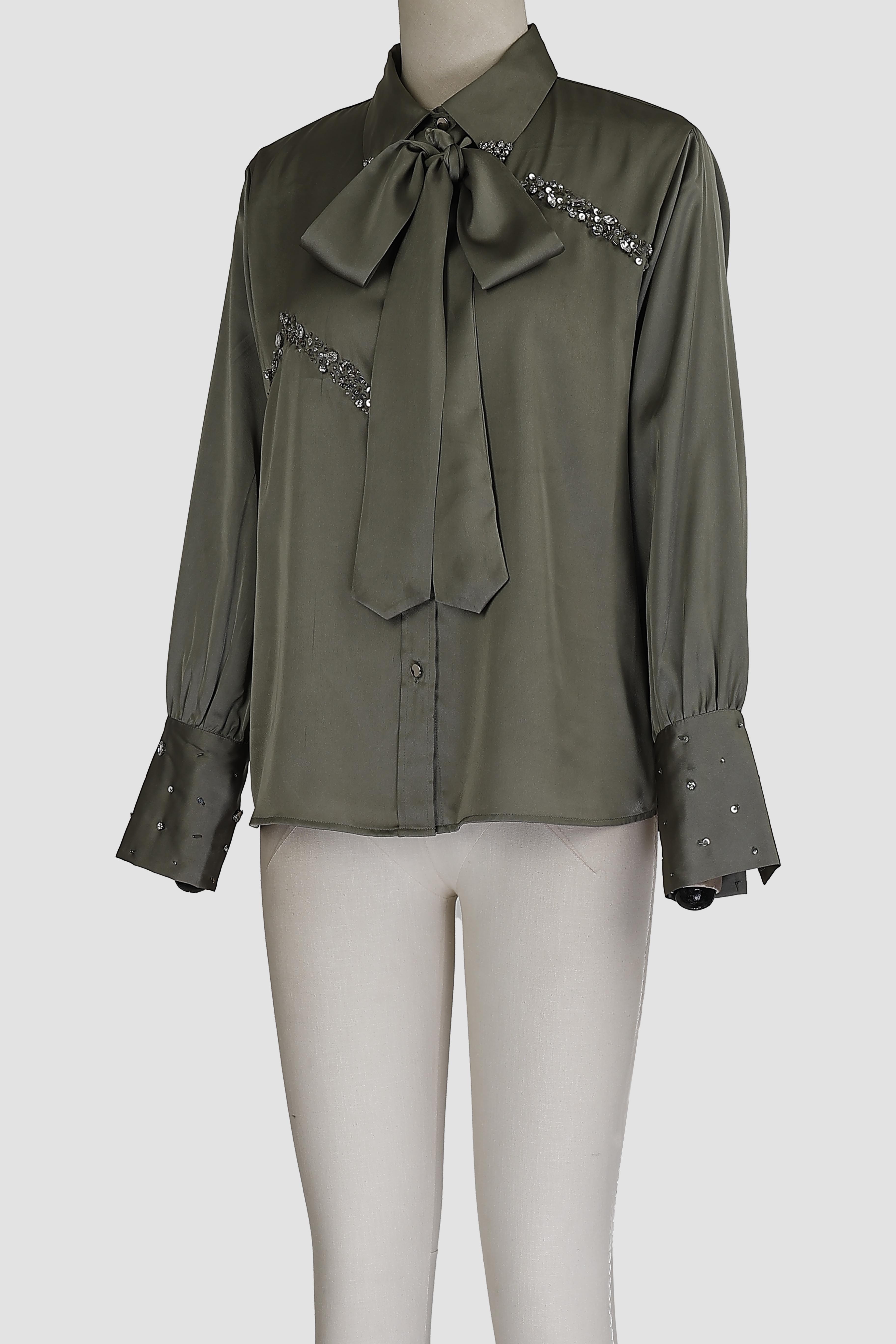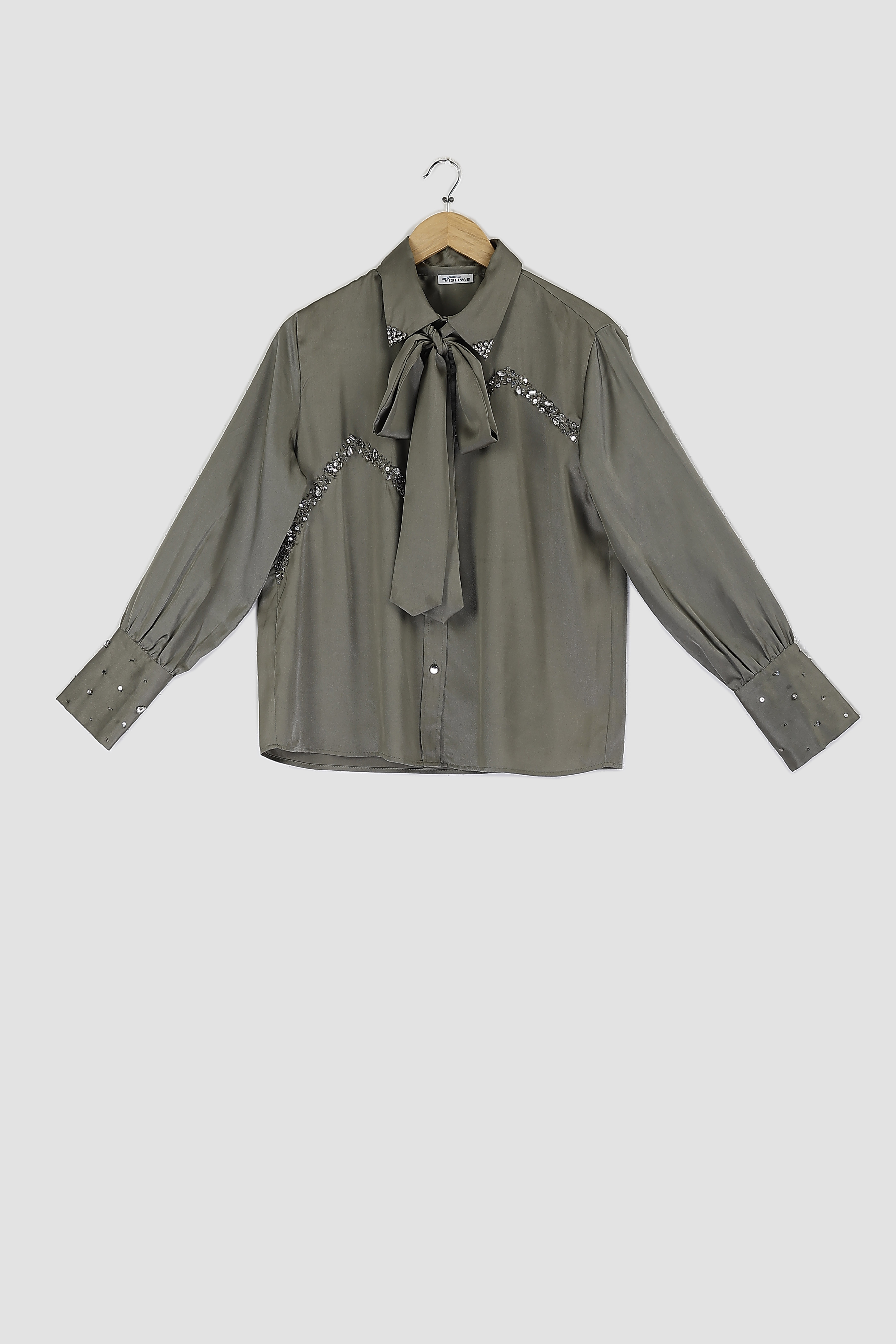 Front opening with metal buttons and shirt collar with tie knot and full sleeves with embellishment shirt.
