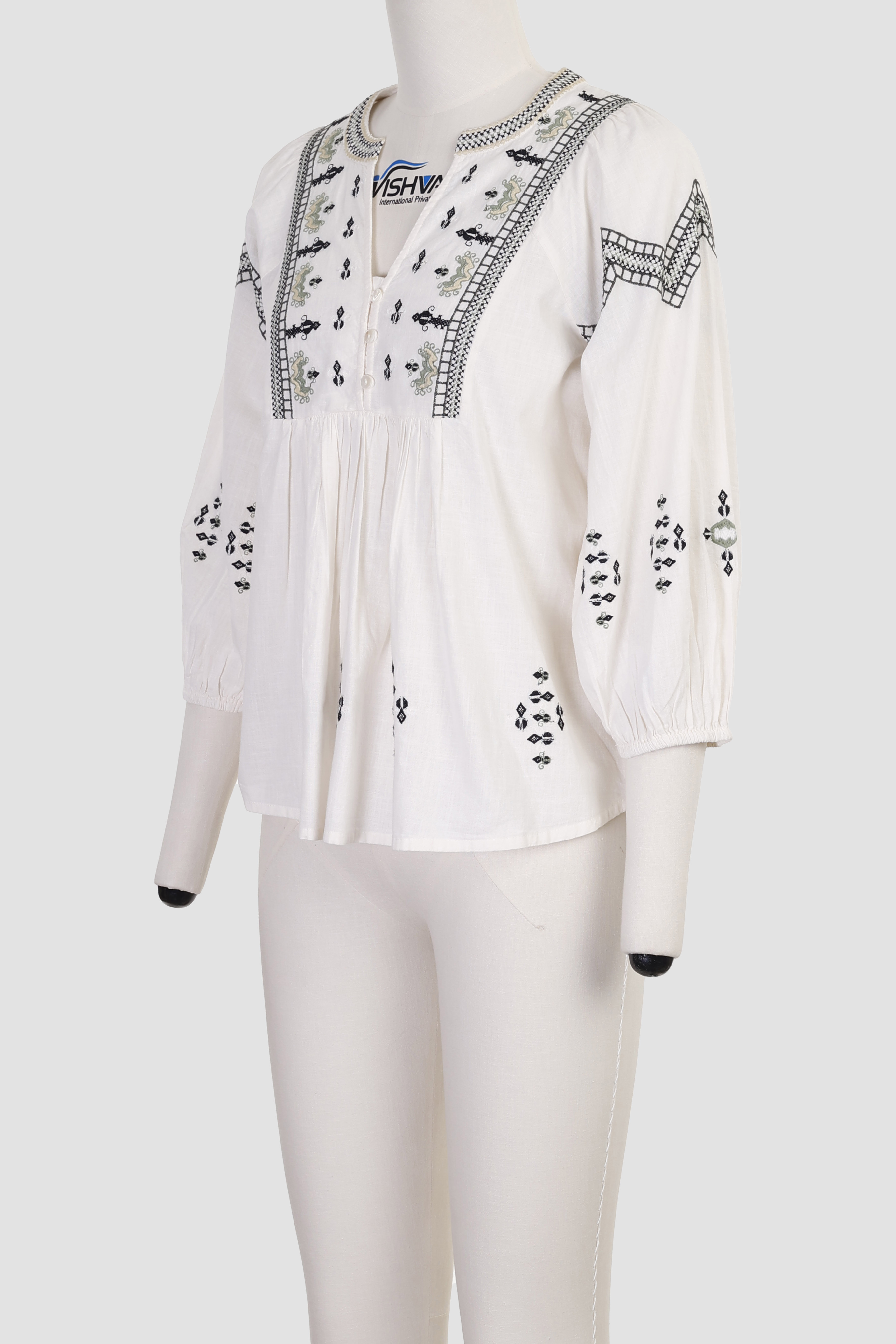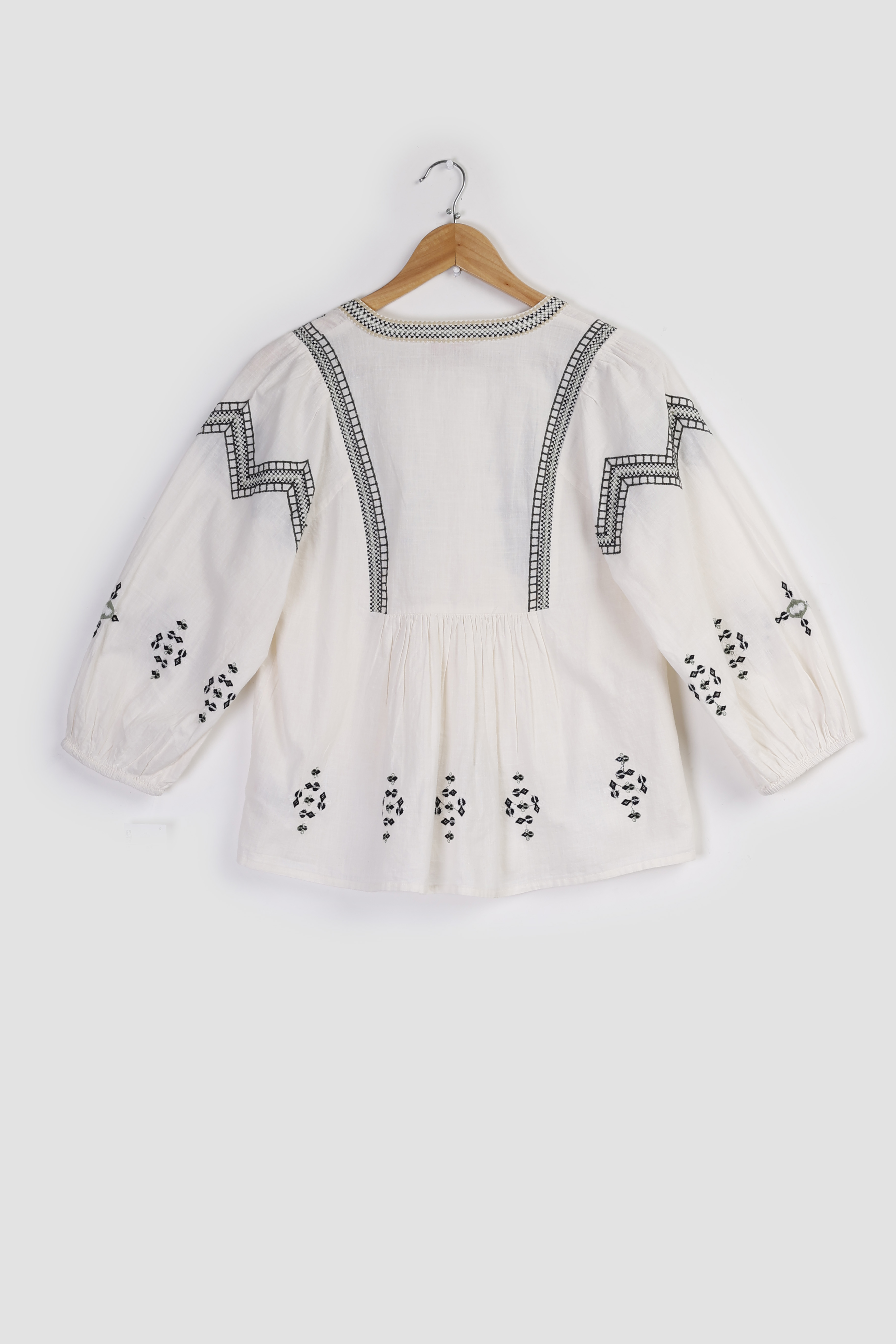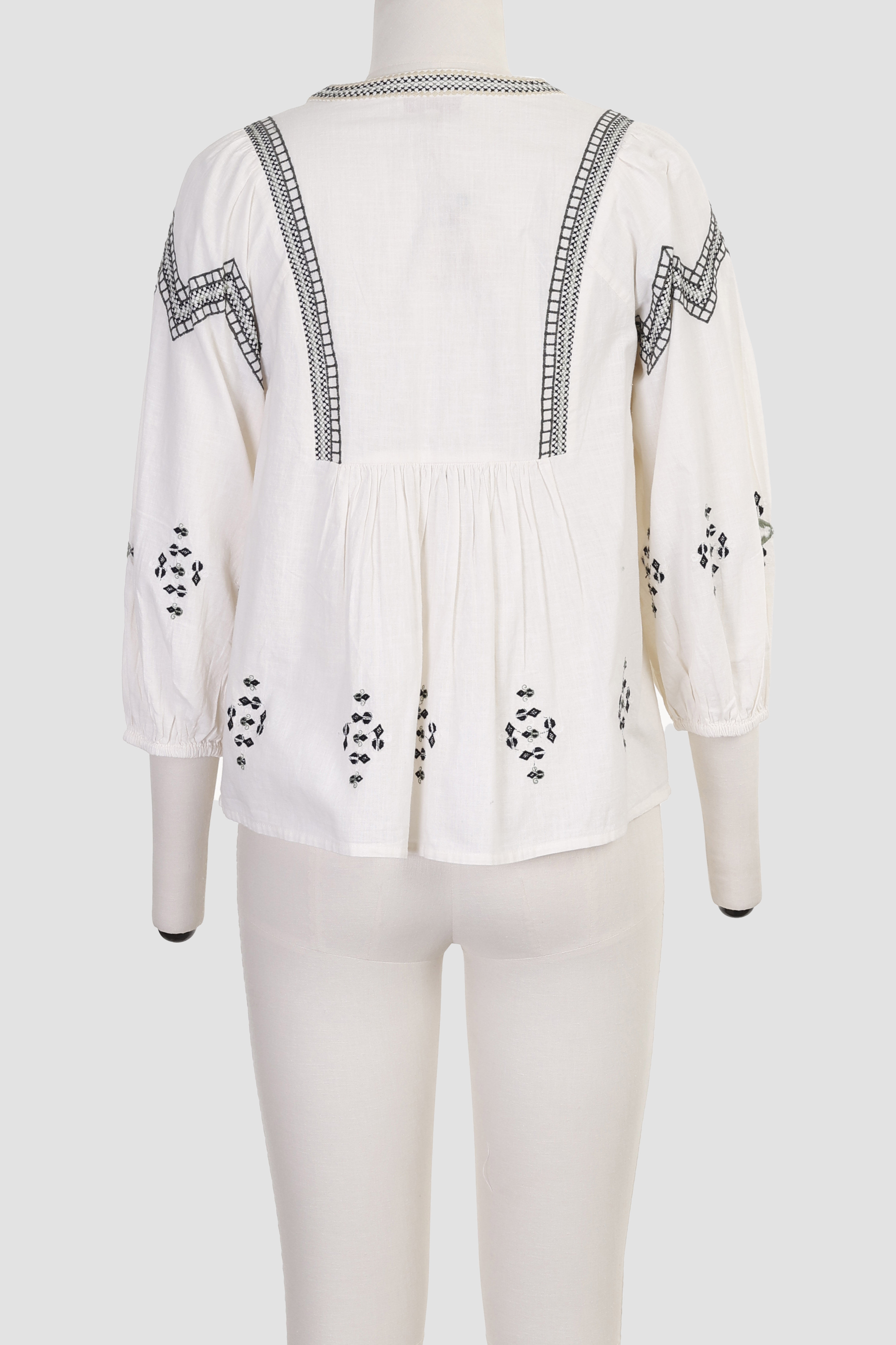 A FULL SLEEVE EMBROIDERED BLOUSE WITH BAND COLLAR.