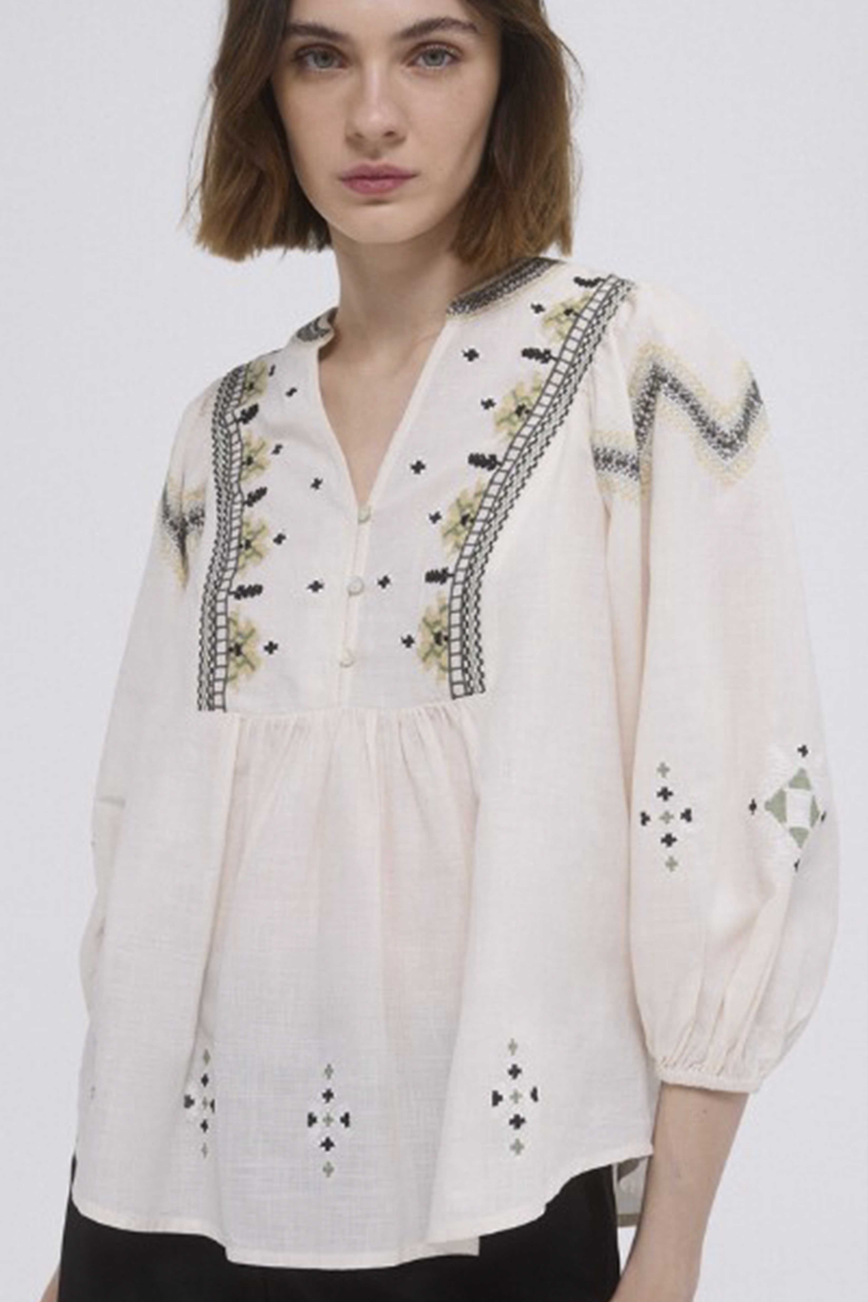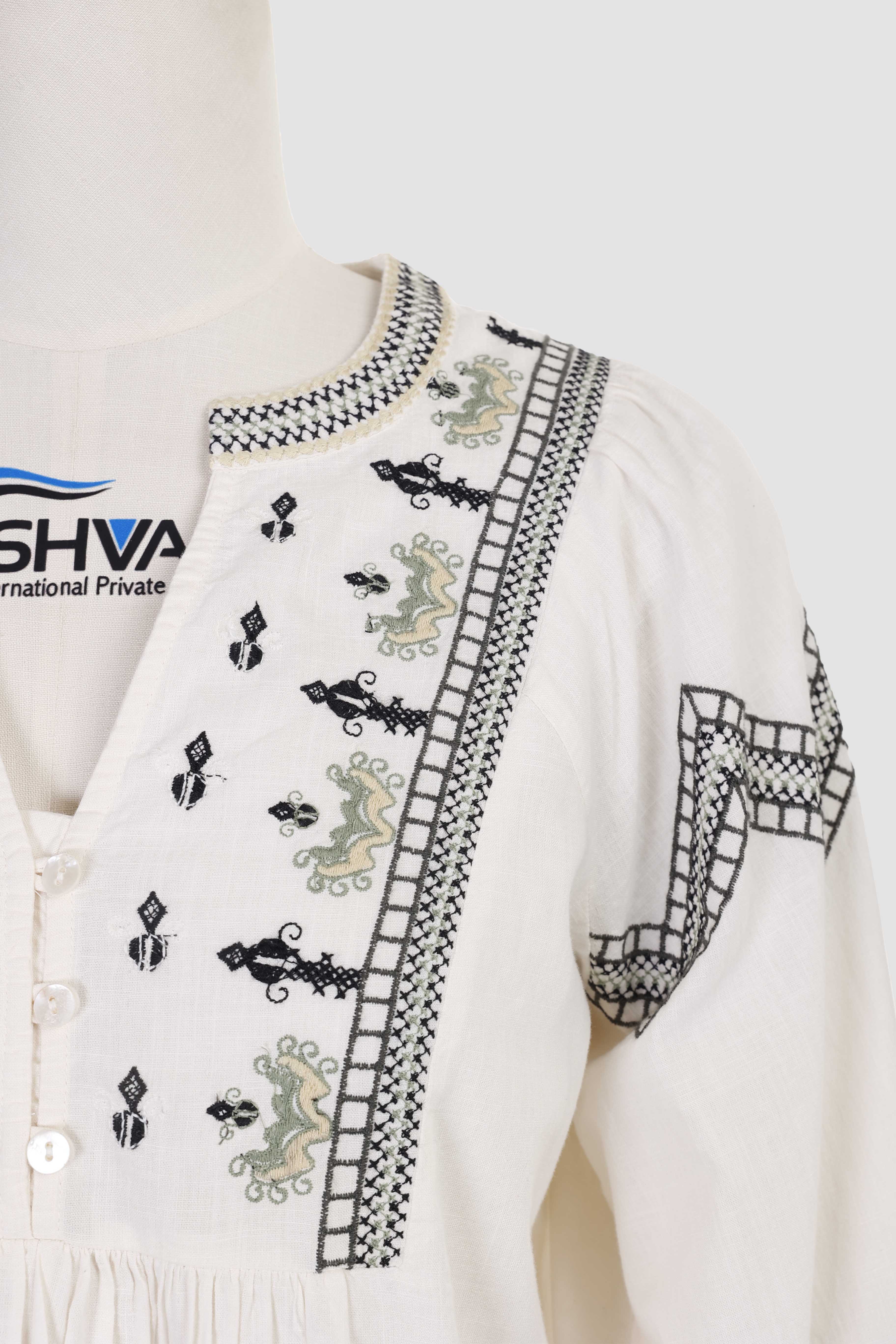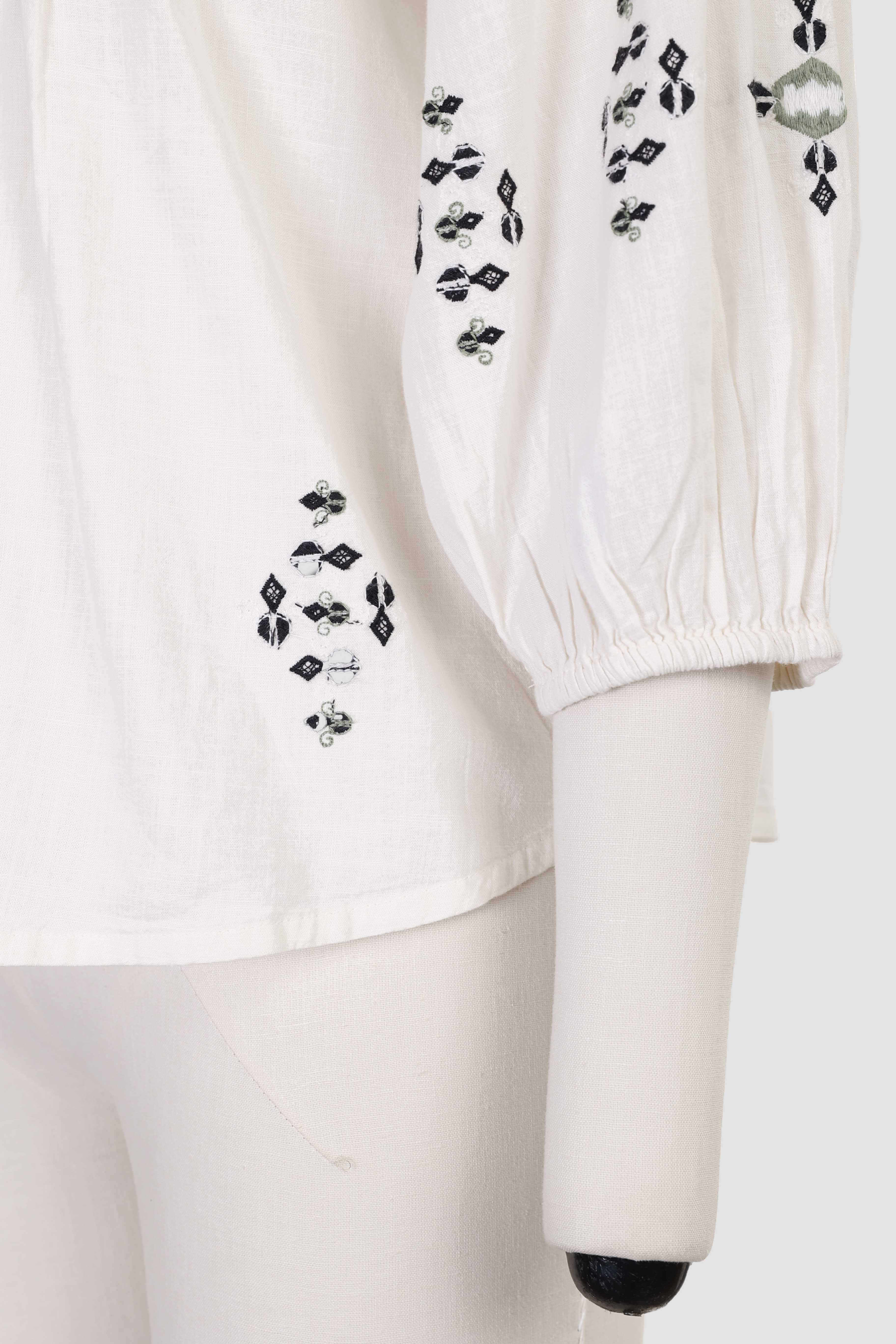 A FULL SLEEVE EMBROIDERED BLOUSE WITH BAND COLLAR.