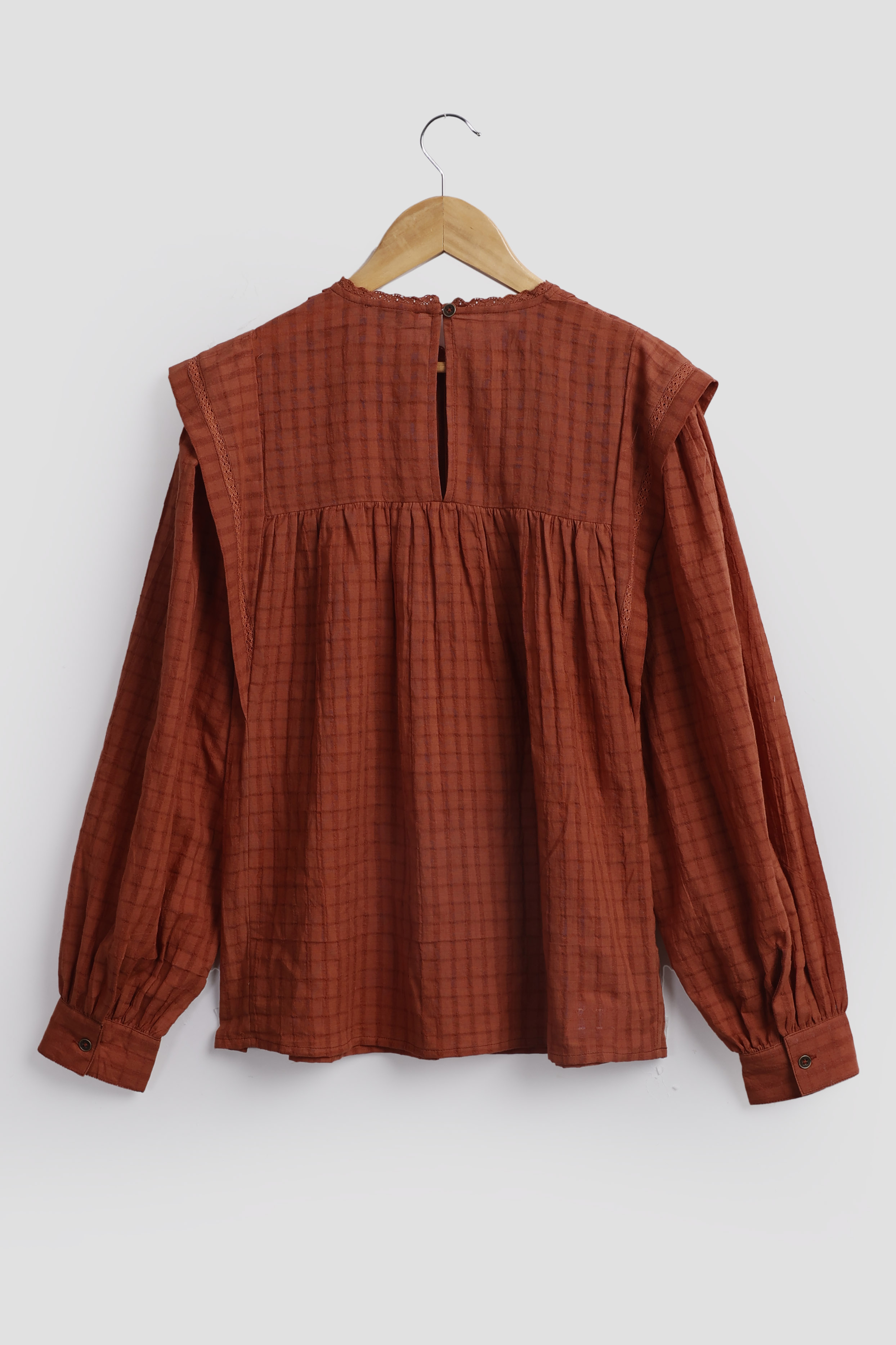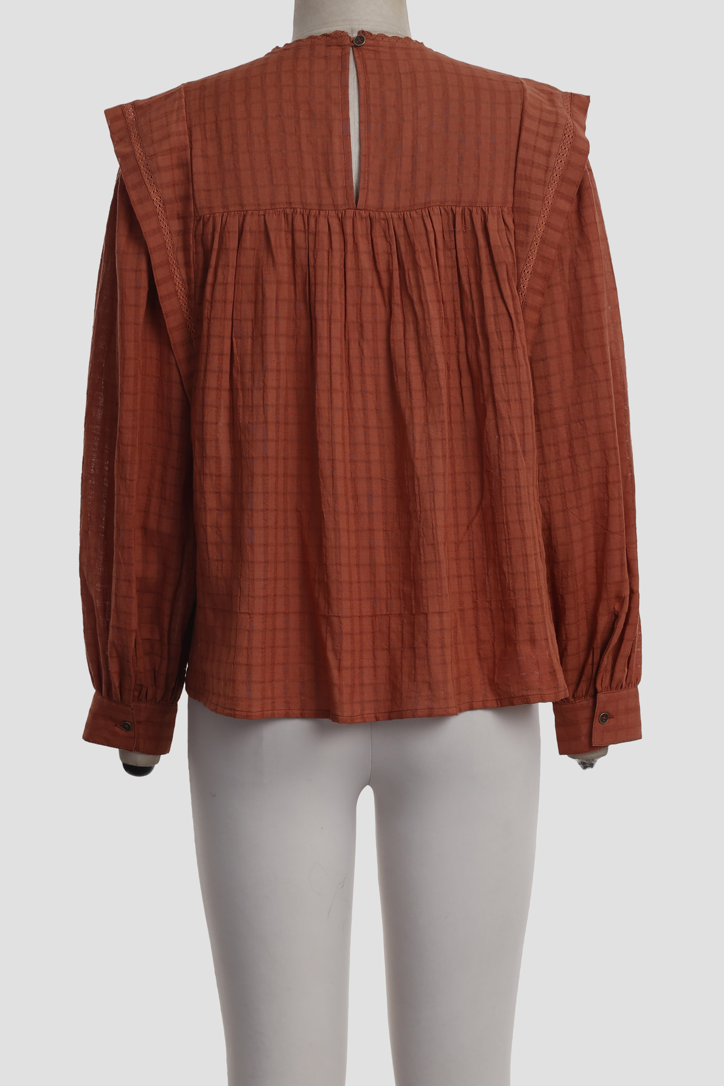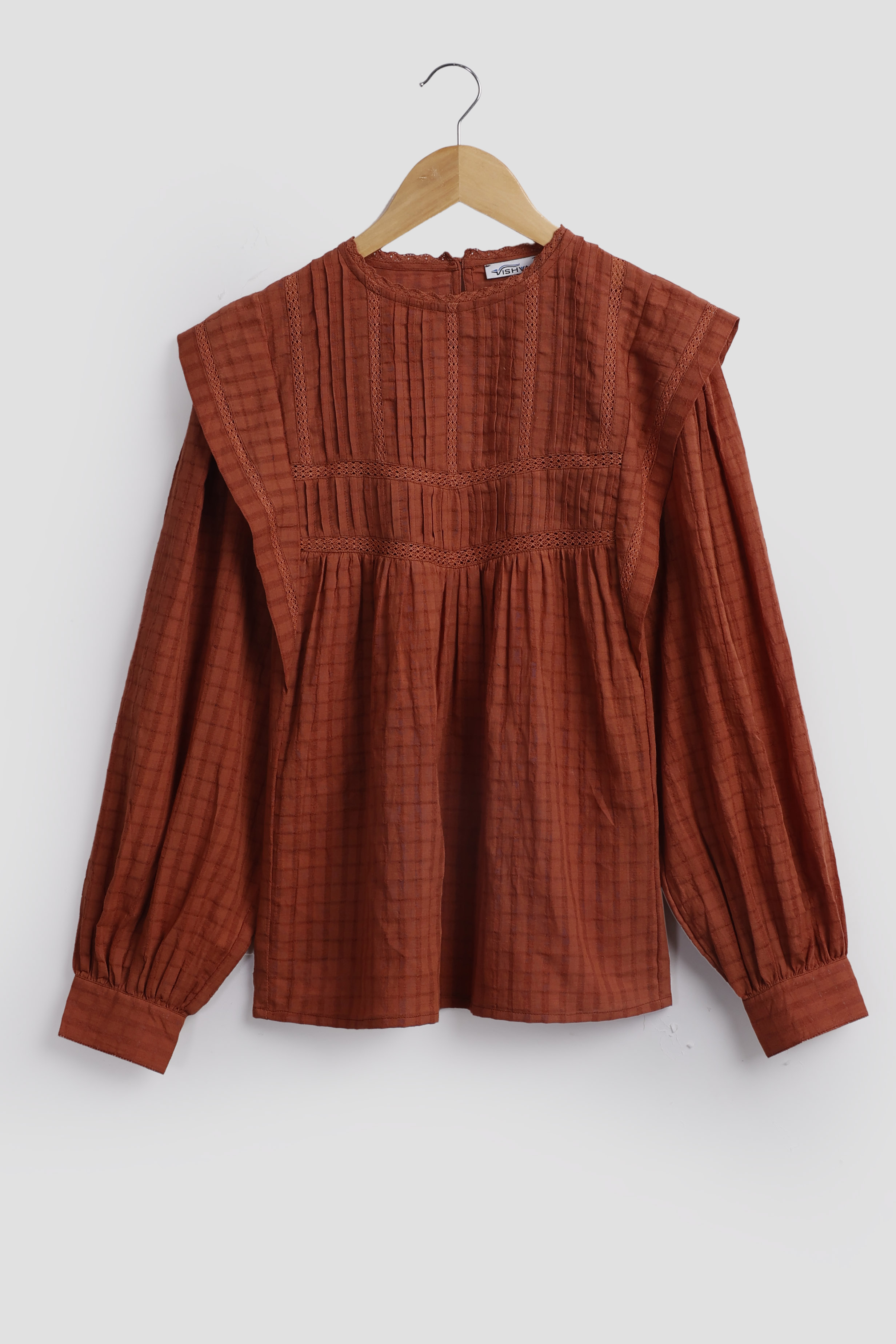 PINTUCK LACE INSERT BLOUSE WITH ROUND NECK AND GATHERS