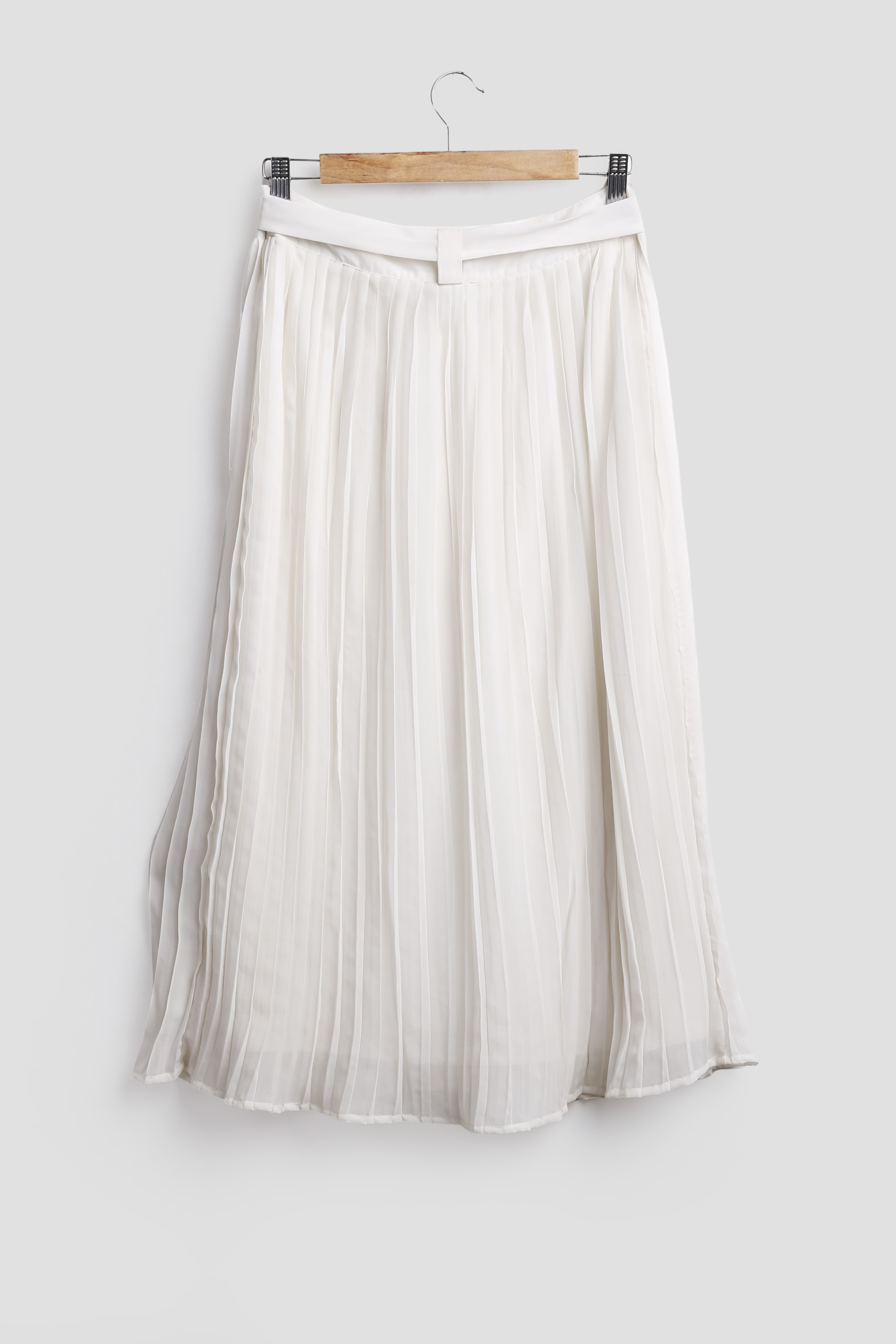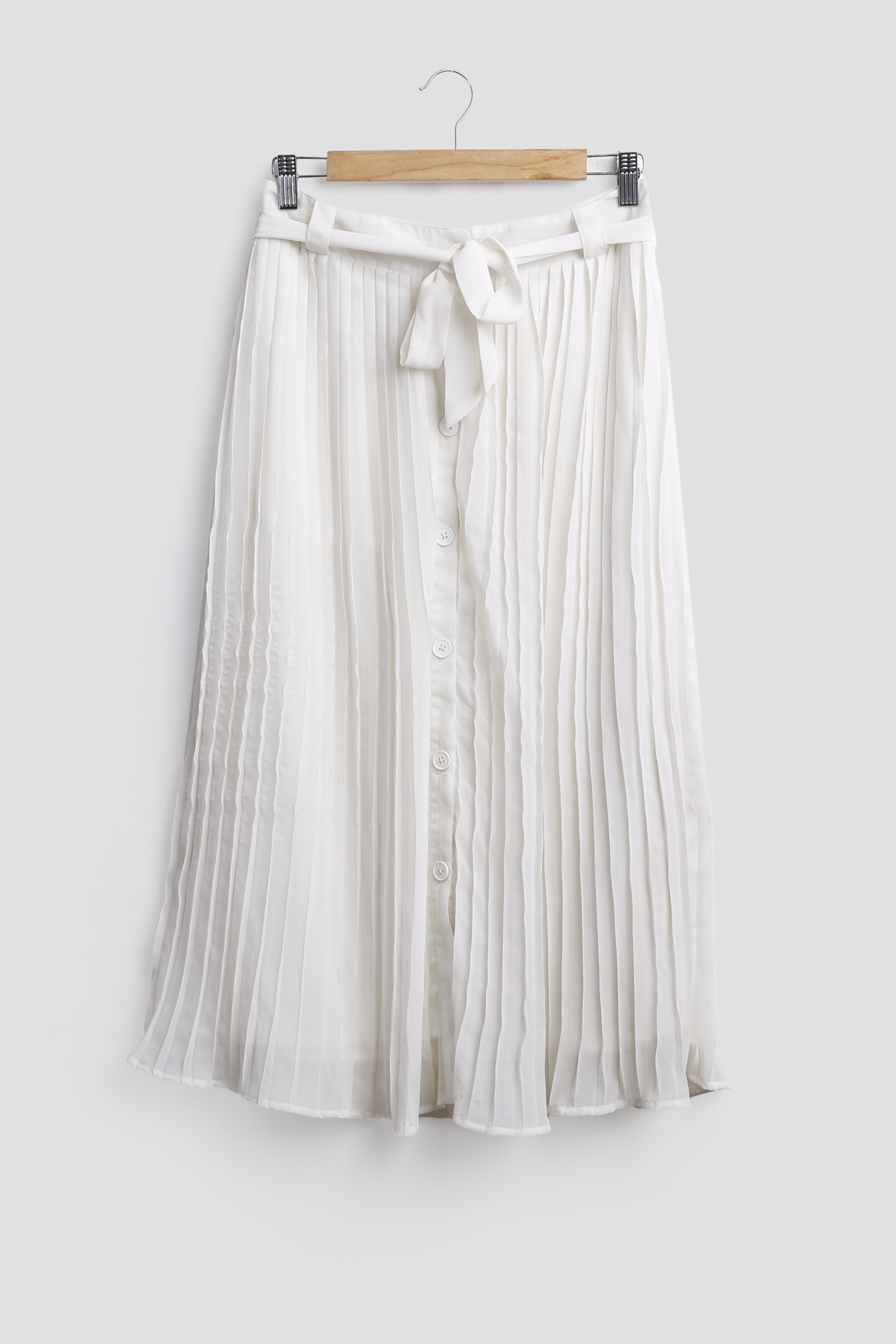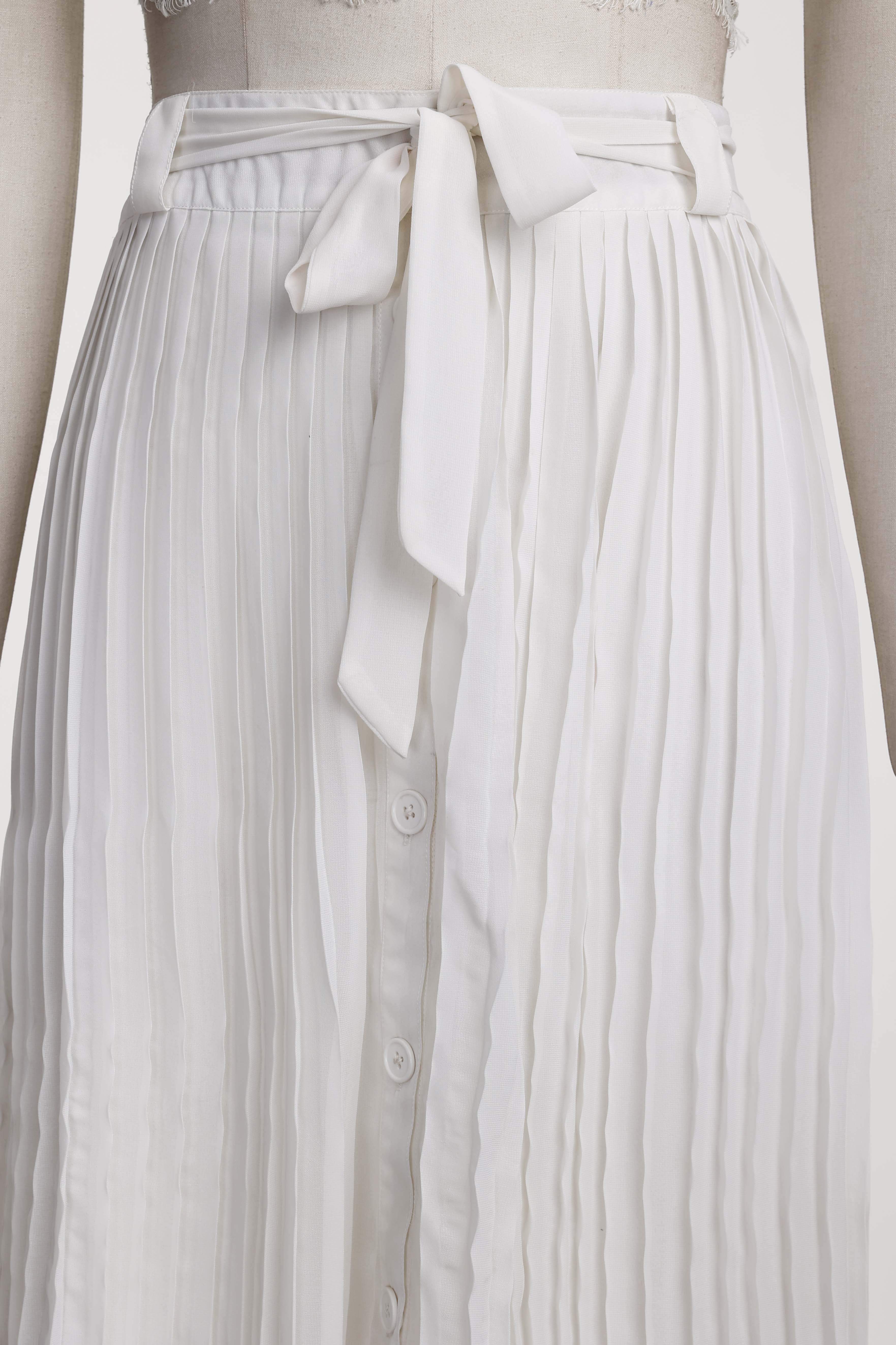 A SKIRT WITH FRONT OPENING BUTTON FASTENING ON FRONT HAVING PLEAT DETAILING IN SKIRT.