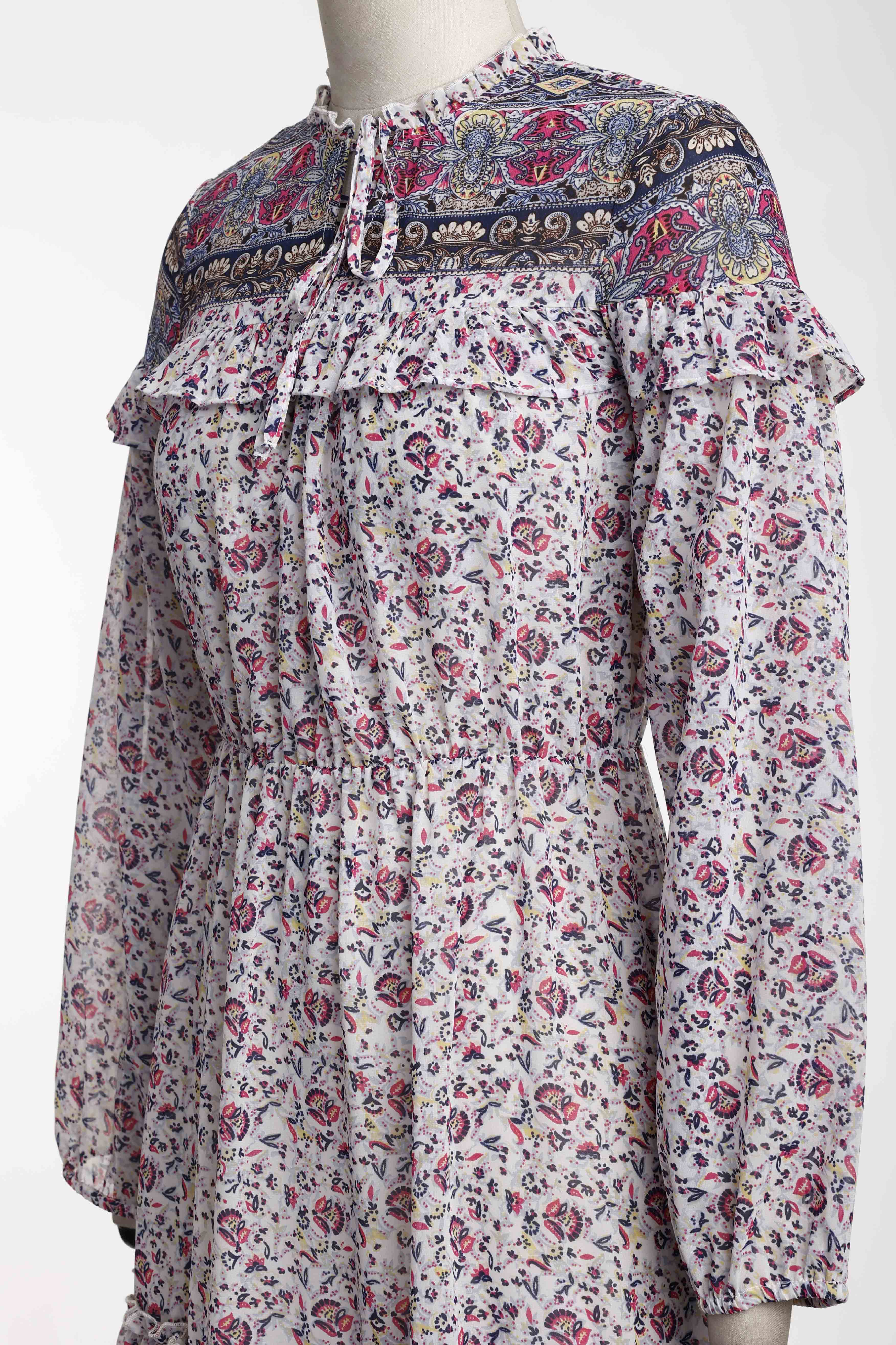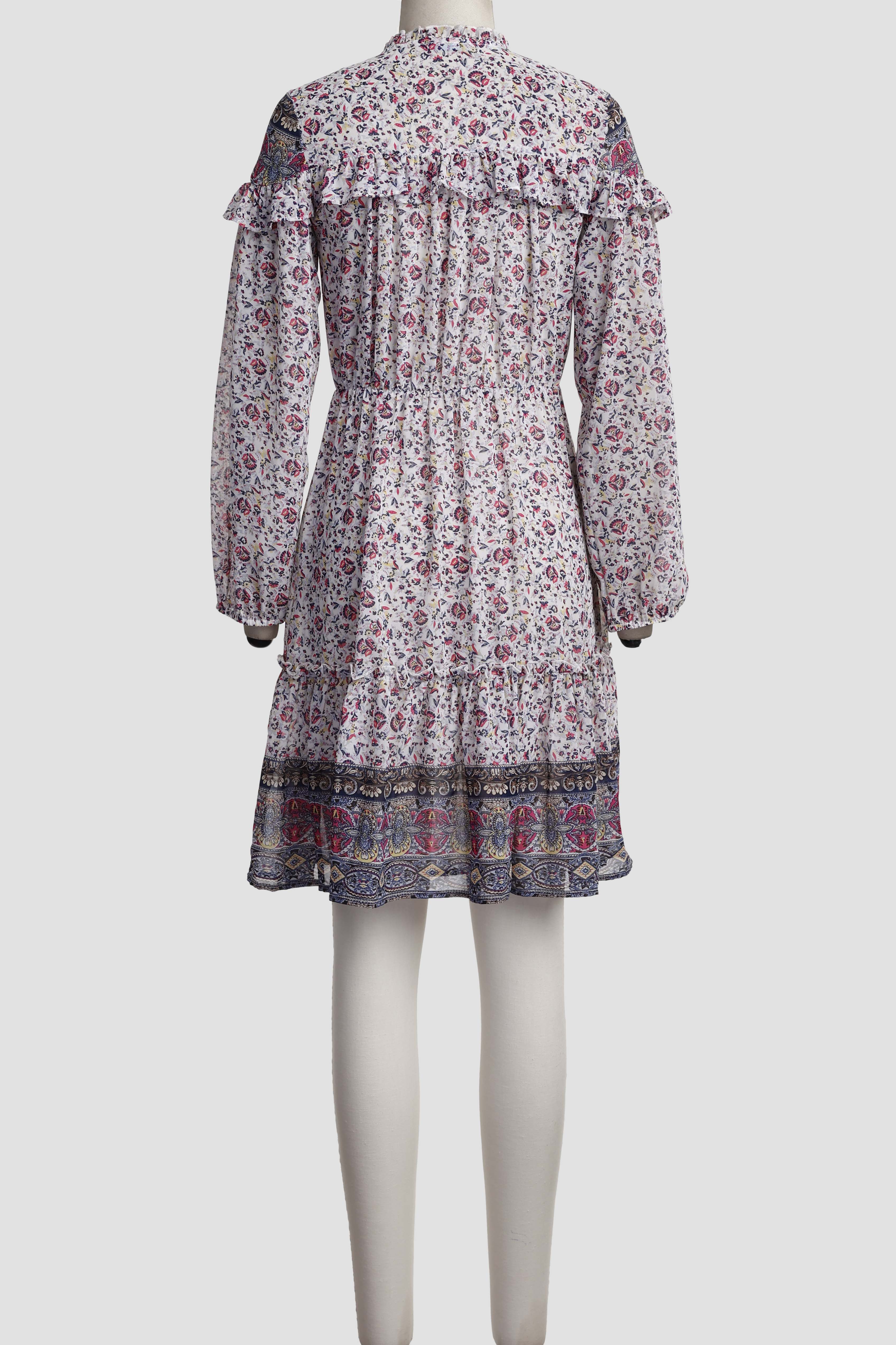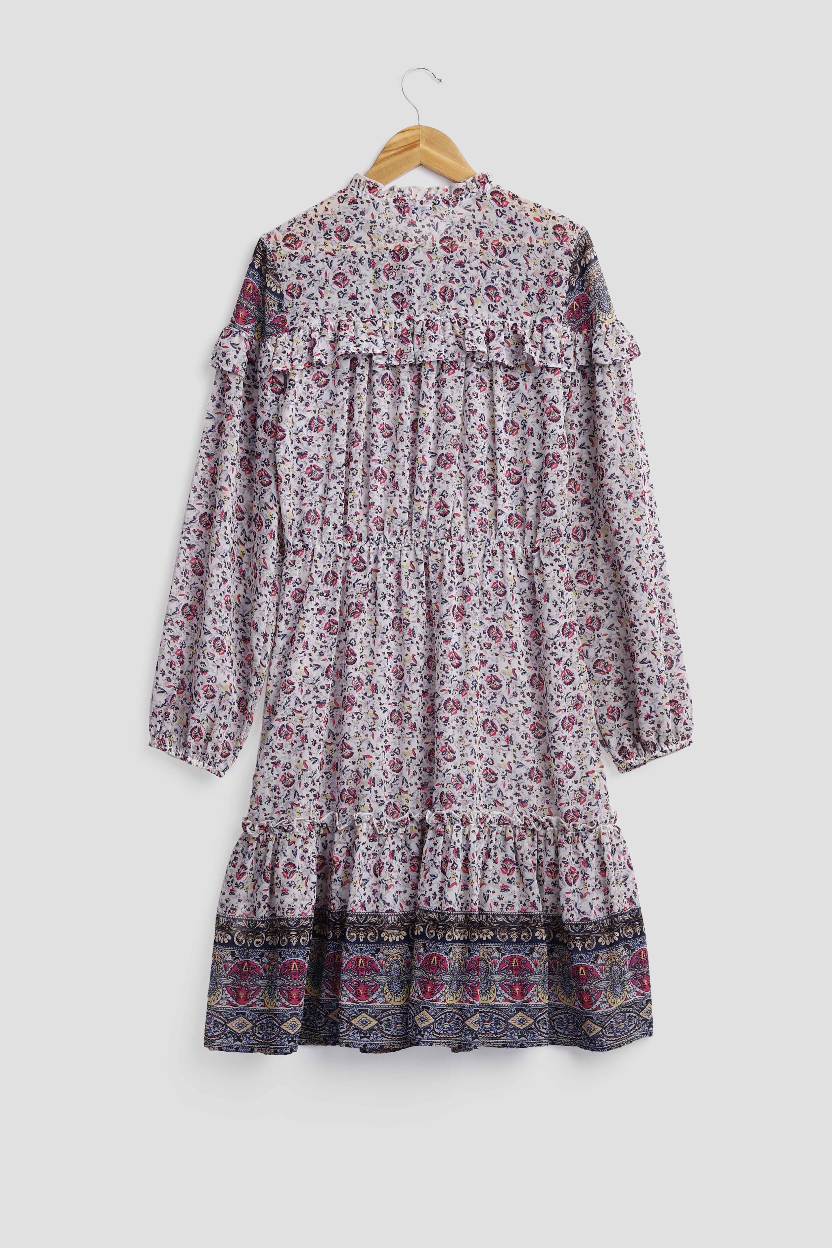 A PRINTED DRESS WITH ELASTICATED SLEEVES HAVING FRILL DETAILING AT DRESS.