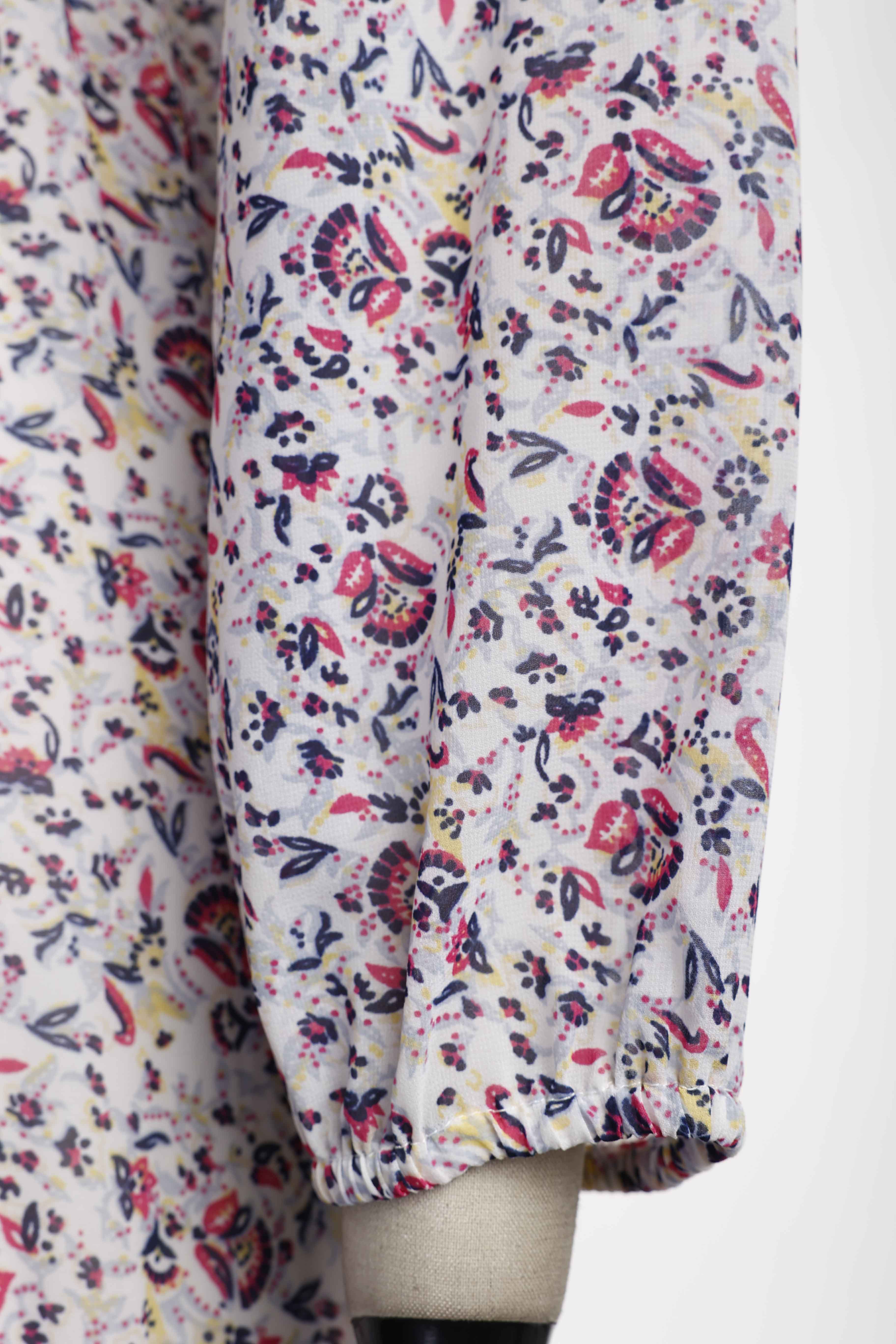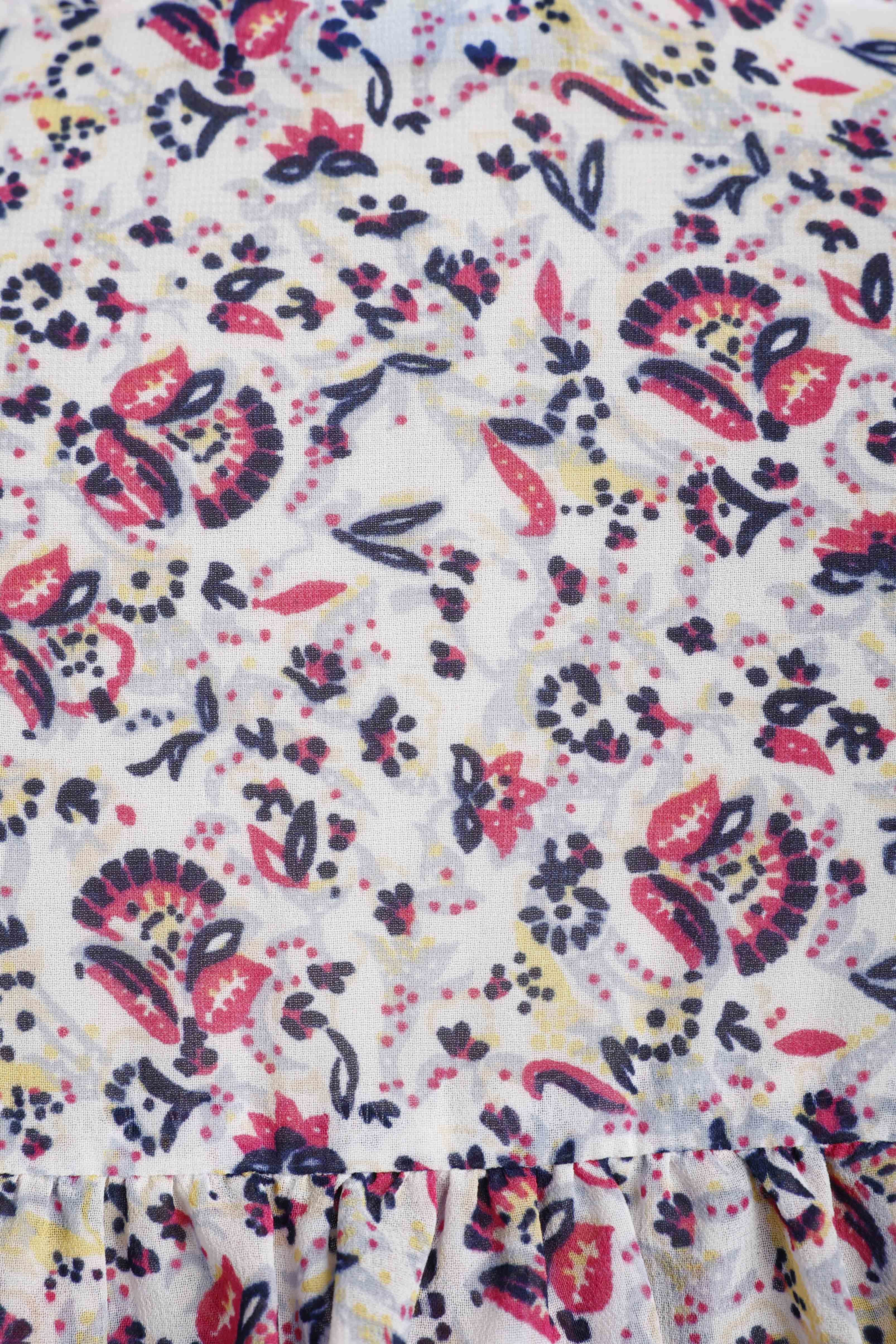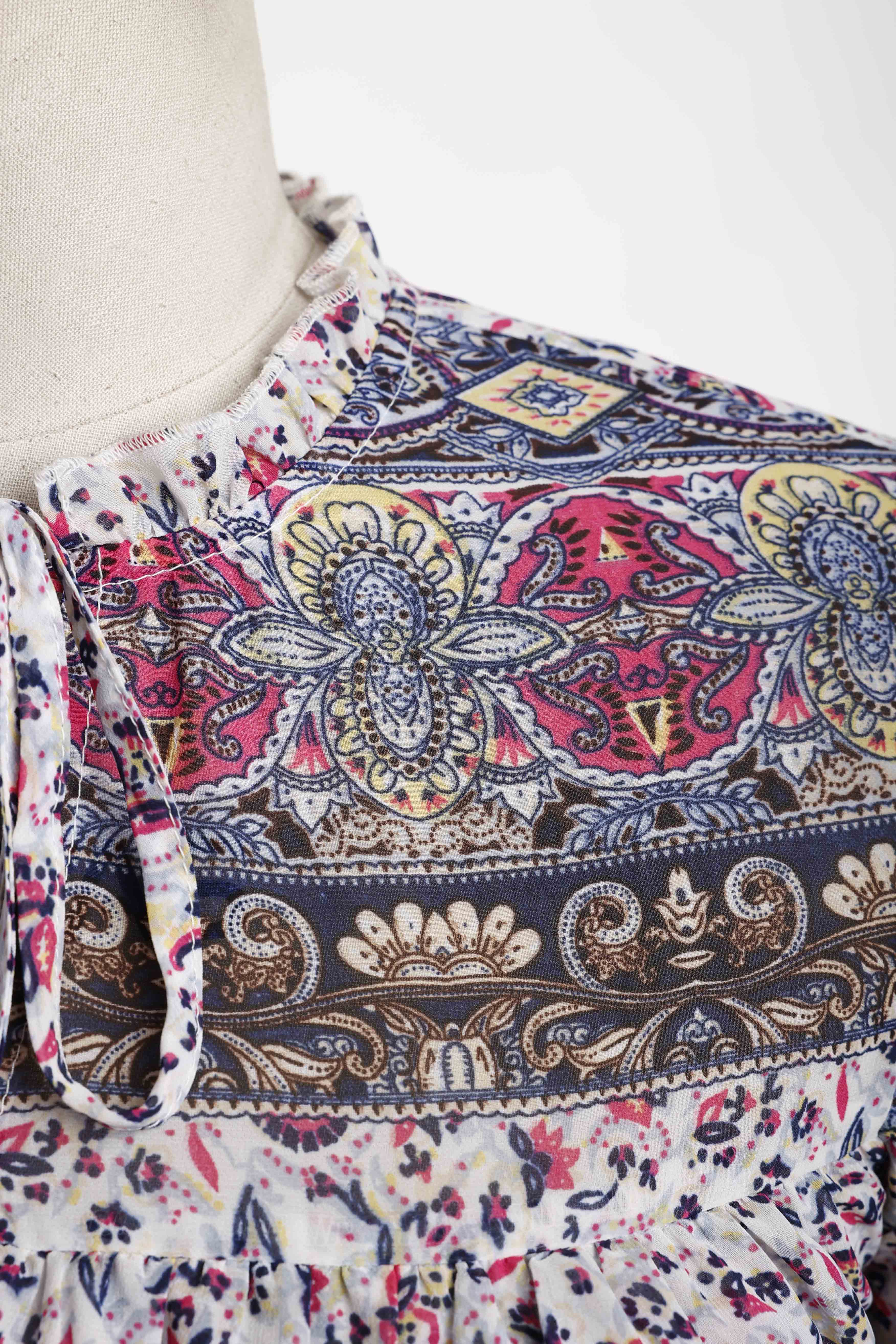 A PRINTED DRESS WITH ELASTICATED SLEEVES HAVING FRILL DETAILING AT DRESS.