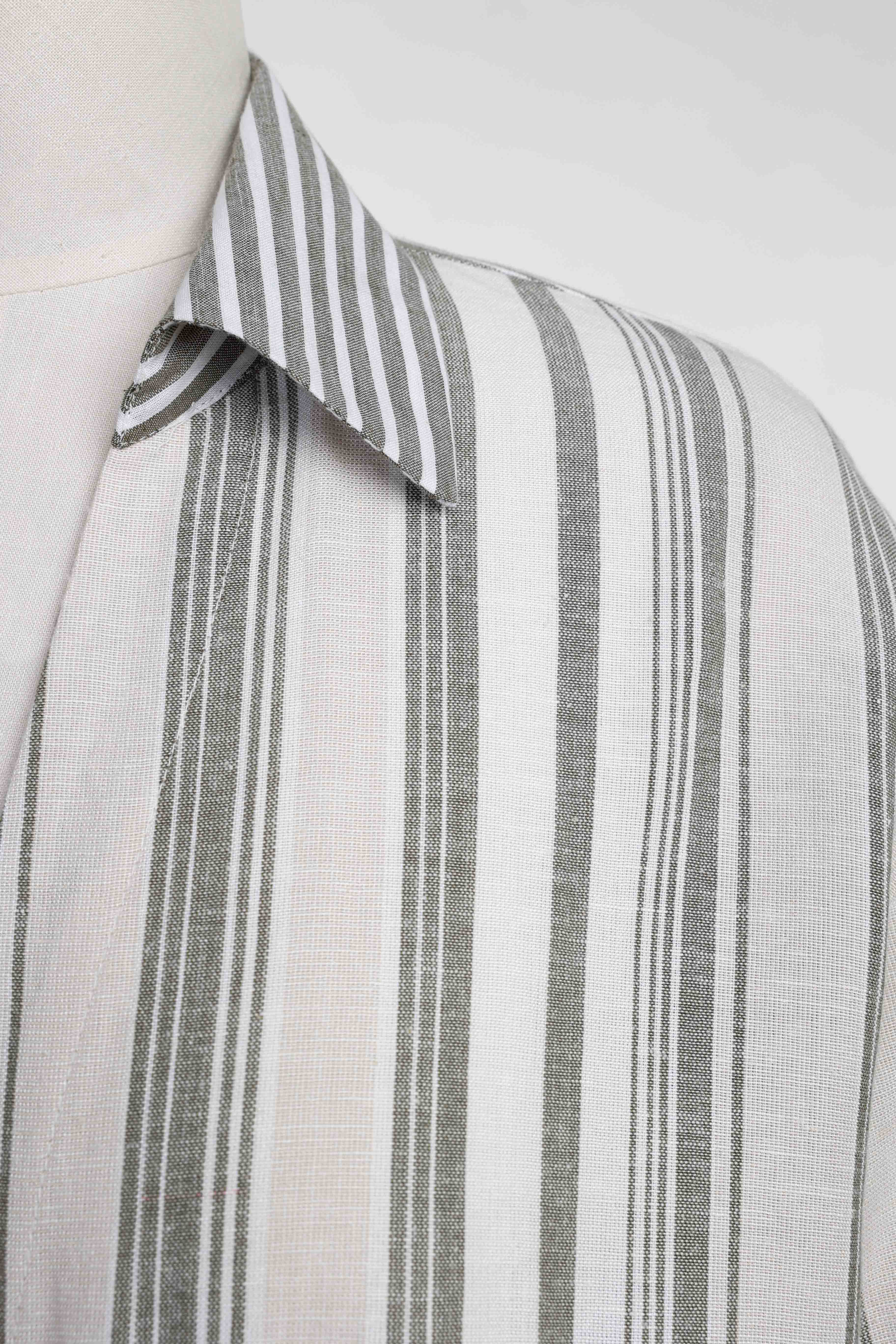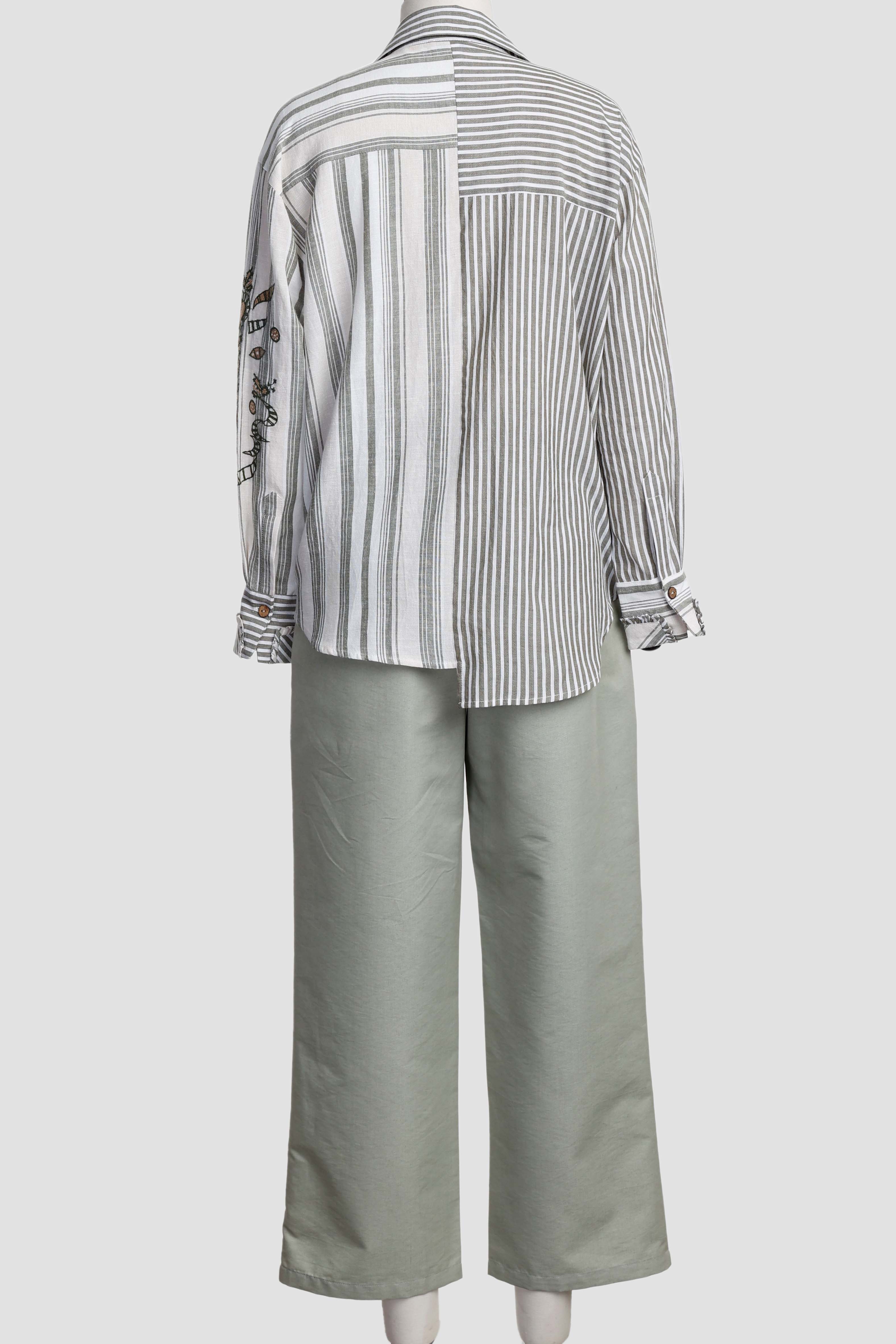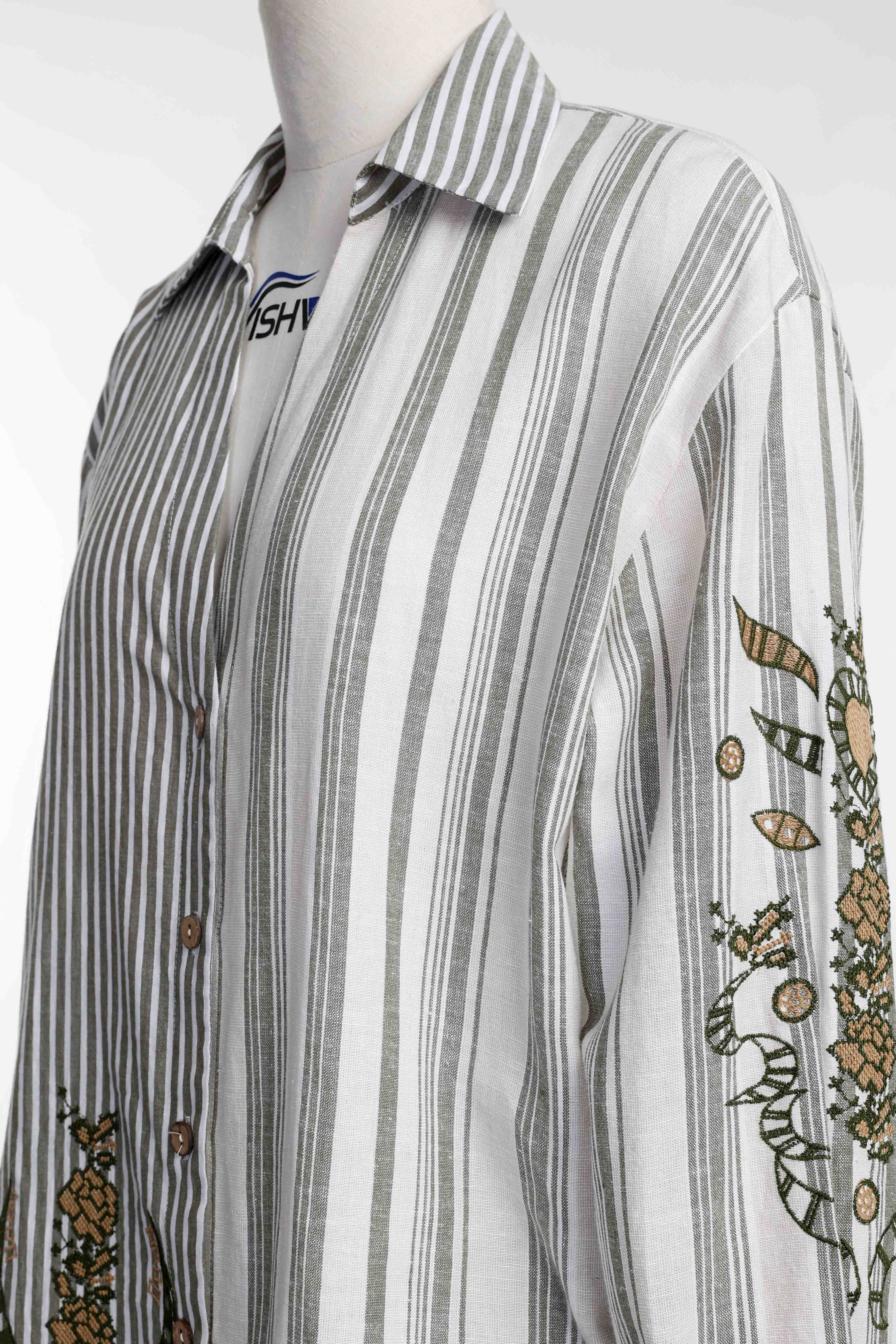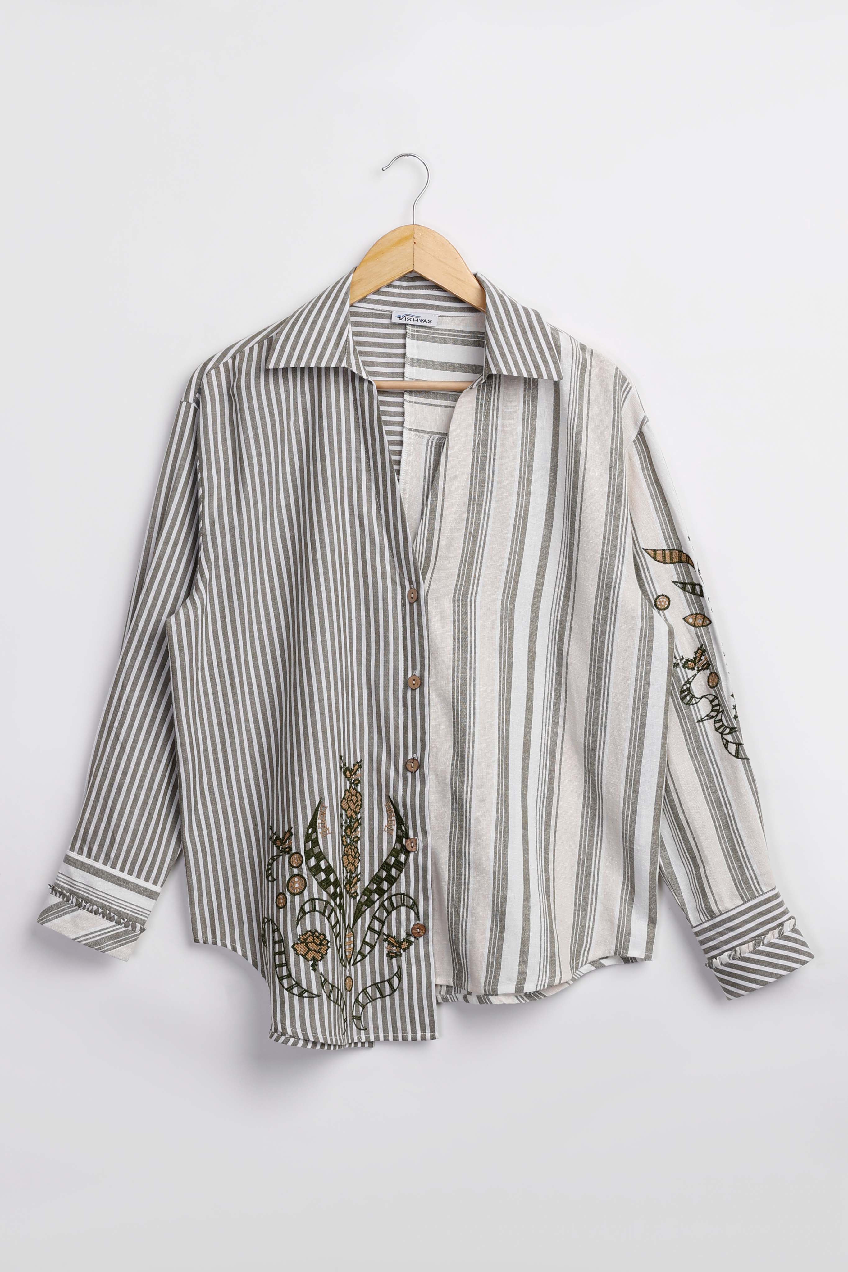 A high low design shirt with machine floral embroidery design at front panel and on sleeves wooden button fastening on the front .